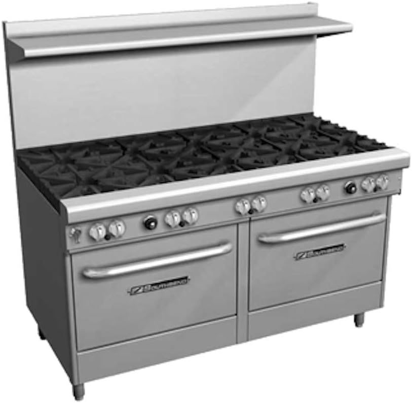 Der Southbend 4605DD‑2TL ist eine leistungsstarke 60″ breite Profiküche-Gasrange, ideal für Restaurantbetriebe. Ausgestattet mit drei Standardbrennern vorne, zwei Pyromax-Brennern hinten, einer 24″ Thermostat-Griddle auf der linken Seite sowie zwei geräumigen Standard-Öfen, bietet dieses Modell maximale Vielseitigkeit für effizientes Großküchenbetrieb.